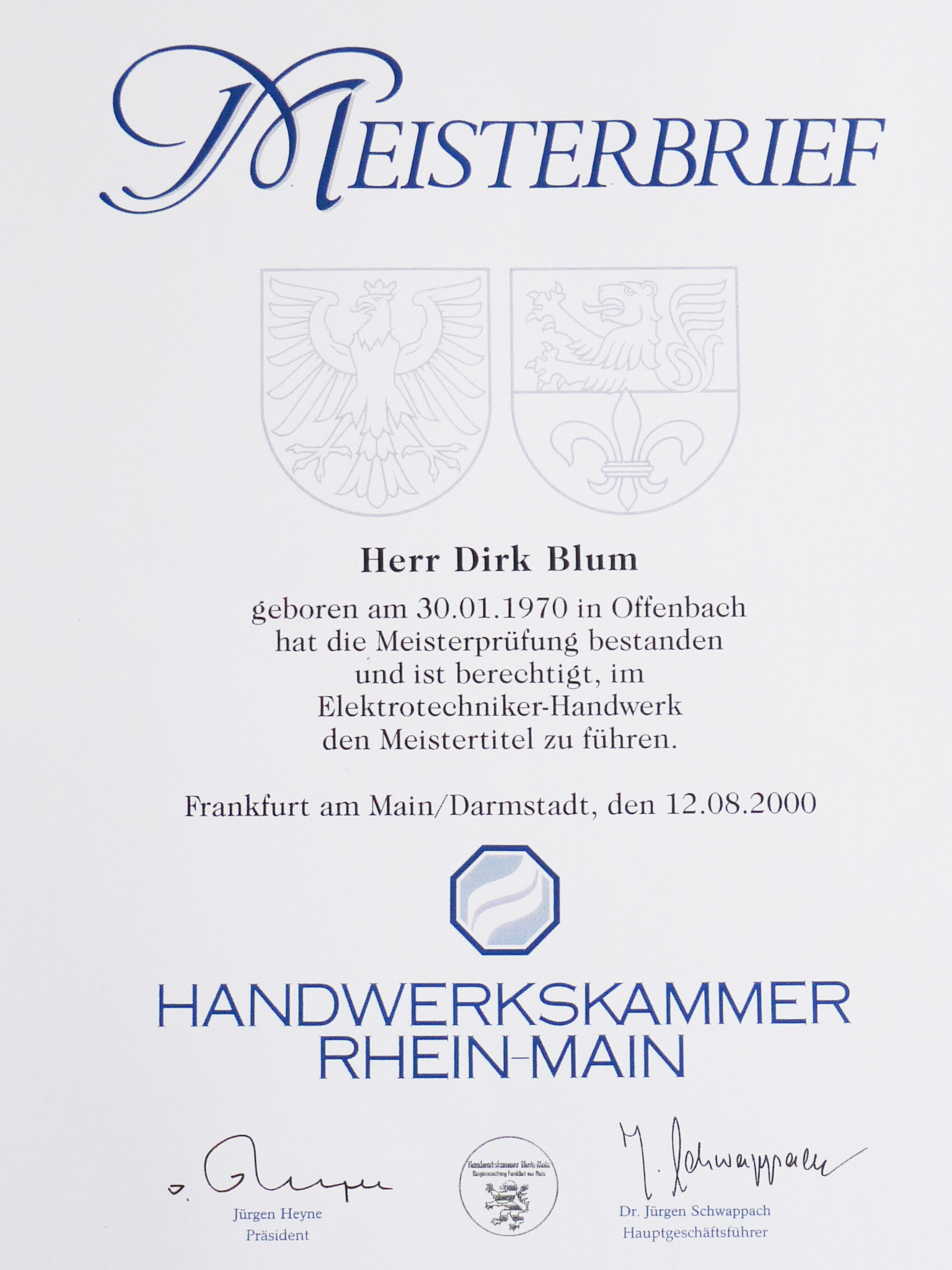 2003 übernahmen die langjährigen Elektromeister Thomas Rost und Dirk Blum den renommierten Fachbetrieb. Durch ständige Schulungen und Weiterbildungen ist es uns gelungen, immer auf dem aktuellen Stand der technischen Entwicklung zu sein und uns erfolgreich im Markt der Elektrotechnik zu behaupten. Unser Betrieb ist seit Anbeginn Mitglied in der Innung für elektro- und informationstechnische Handwerke Offenbach und bildet jährlich im Berufsfeld Elektrotechniker, Fachrichtung Energie- und Gebäudetechnik aus.